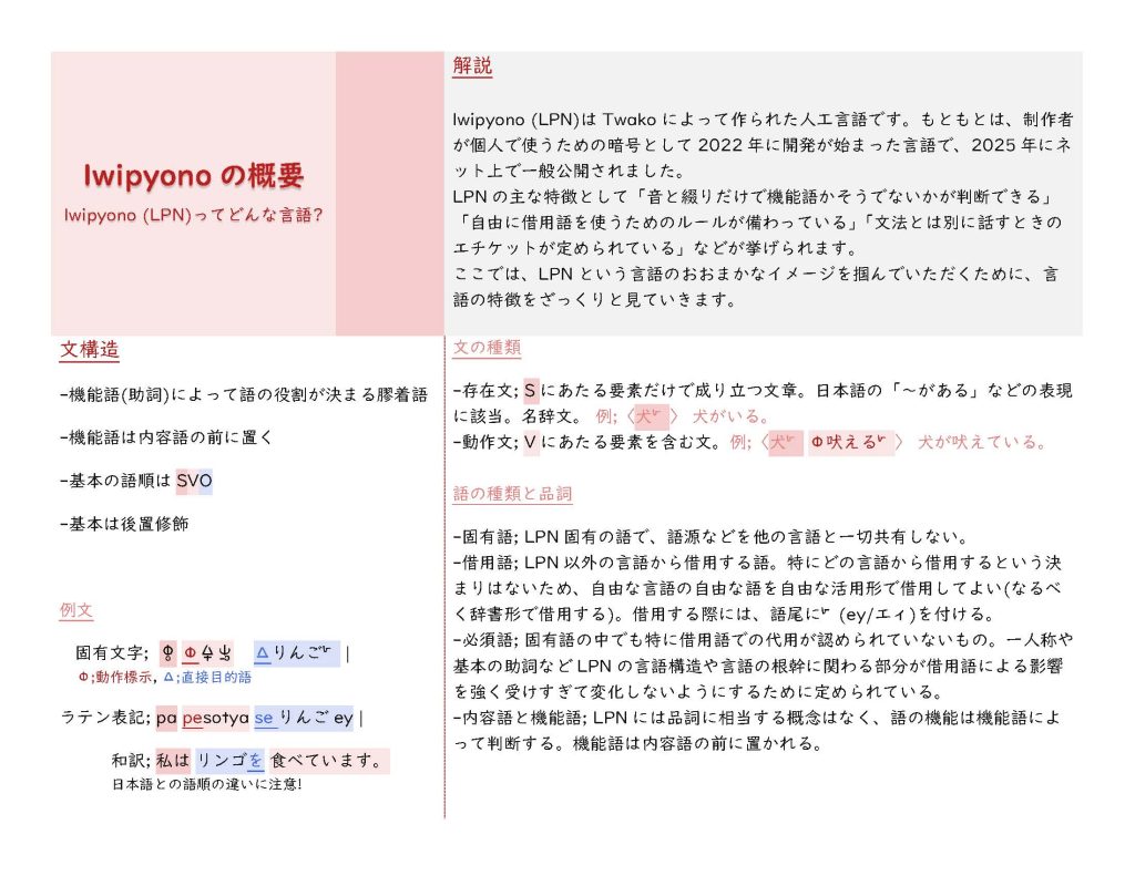 まずは lwipyono (LPN/ルィピョノ) という言語の全体像と雰囲気をつかみましょう。